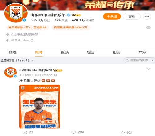 山東泰山官博超一周未更新,上次更新是3月6日為澤卡慶生